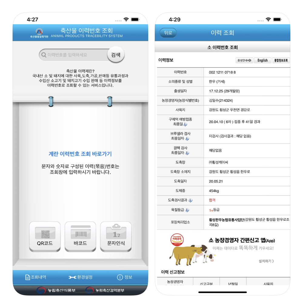 축산물 이력제 홈페이지나 앱에서 이력 정보를 확인해서 이 소가 어디서 태어나고 자랐는지,